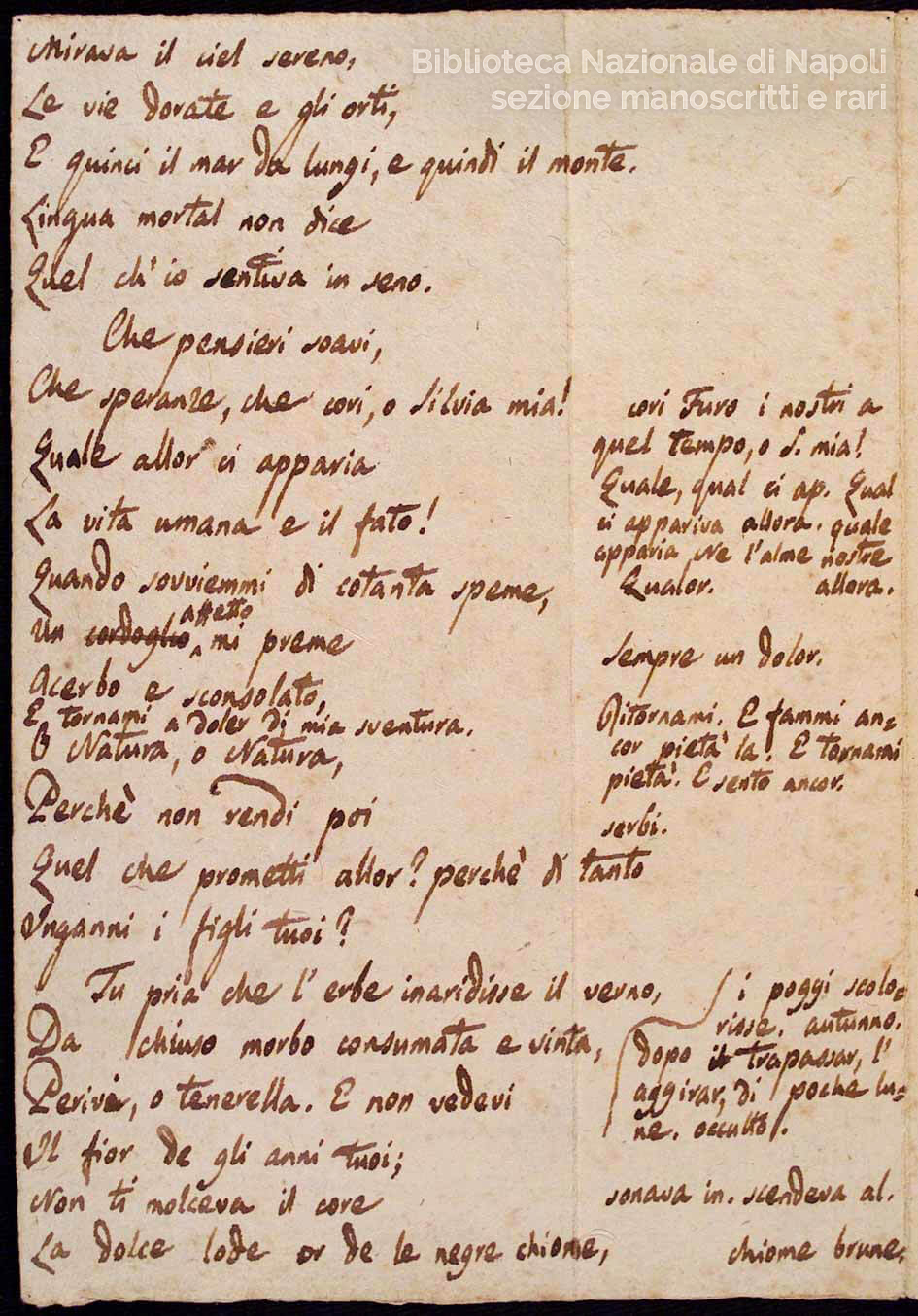 Alla morte di Giacomo Leopardi nel 1837, i suoi autografi rimasero in possesso di Antonio Ranieri, amico napoletano del poeta, che le custodì e ne preservò l'integrità per oltre cinquant'anni. Ranieri ne dispose il passaggio per lascito testamentario alla Biblioteca Nazionale di Napoli, a cui le carte sarebbero pervenute, tuttavia, soltanto al termine di una lunga controversia giudiziaria.